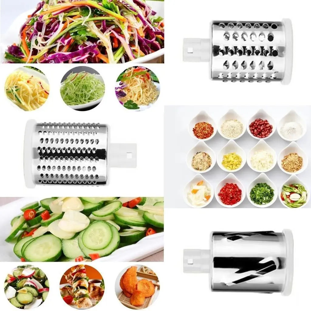 ✔️Sus cuchillas redondas permiten un corte uniforme y continuo de 360°, optimizando el tiempo y el esfuerzo. Incluye 3 cabezales para rallar, cortar y picar con precisión.