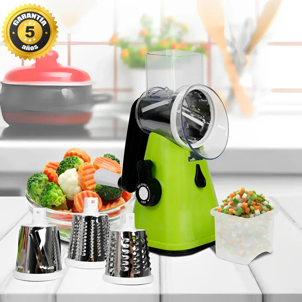 ✔️Diseñado para cortar en rodajas, dados o rallar en segundos, es ideal para verduras, frutas, queso, frutos secos y más, con un acabado perfecto